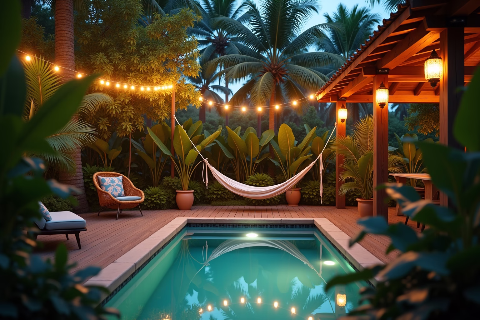 Auch die Wahl der Materialien trägt maßgeblich zum Urlaubsfeeling bei. Natürliche Materialien wie Holz, Stein und Rattan vermitteln Wärme und Geborgenheit. Verwende Holz für Terrassendielen, Zäune oder Gartenmöbel. Naturstein eignet sich hervorragend für Wege, Mauern oder als Dekorationselement. Rattanmöbel sind leicht, bequem und versprühen einen Hauch von Exotik.